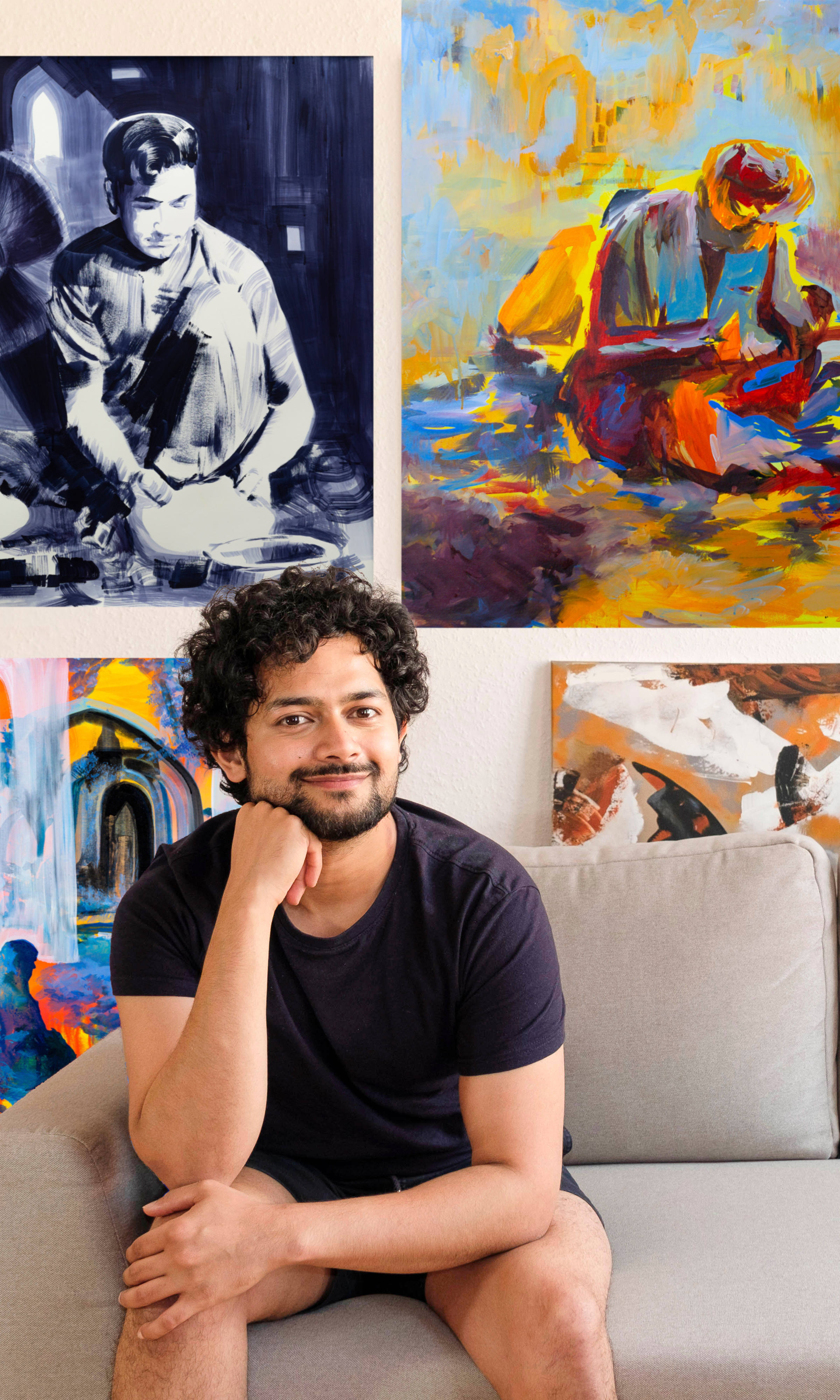 Die monochromen Gemälde erscheinen in einem intensiven Blau, das aus der Nähe verschiedene weitere Nuancen preisgibt. Die farbigen Gemälde bestehen aus schillernden Farbkompositionen, in denen vor allem das Mango-Orange und das intensive Kolbaltblau leuchten. Diese Farben sind eine weitere Referenz an sein Heimatland: Die Mango ist eine der wichtigsten Früchte, die in Pakistan gedeihen, das Kobaltblau wird seit Jahrhunderten in der islamischen Dekoration, insbesondere bei kostbaren gefliesten Oberflächen, genutzt.